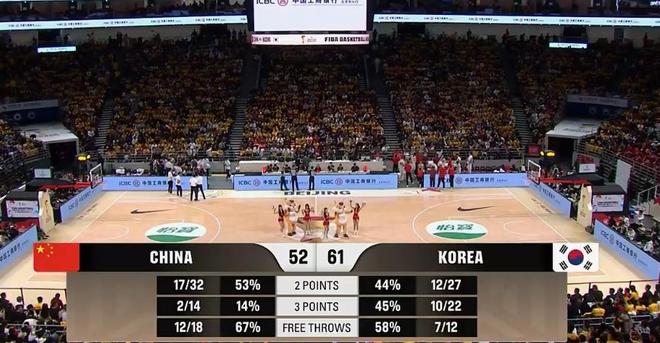 但好在第三节韩国队体能也有所下降,三分攻势放缓罚球失准给了中国队追分机会,三节战罢,中国队52-61将分差艰难追到9分。