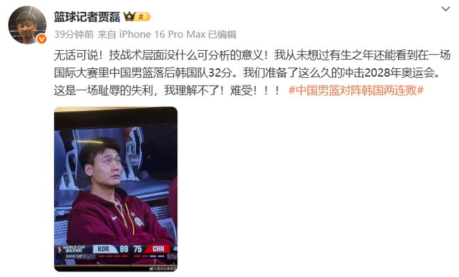 然而,与首战的憾负不同,这场14分的失利过程更为艰难,一度落后多达32分的局面,深深刺痛了无数关心中国篮球的人,篮球记者贾磊在社交媒体上直言:“我从未想过有生之年还能看到在一场国际大赛里中国男篮落后韩国队32分……这是一场耻辱的失利,我理解不了!难受!”