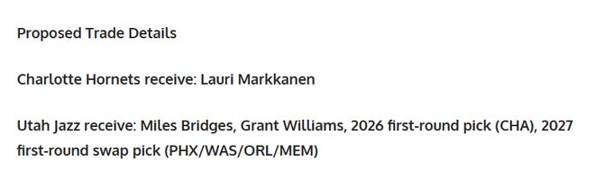 ✅爵士得到:布里奇斯、格兰特・威廉姆斯、2026年黄蜂首轮签、2027年首轮交换权